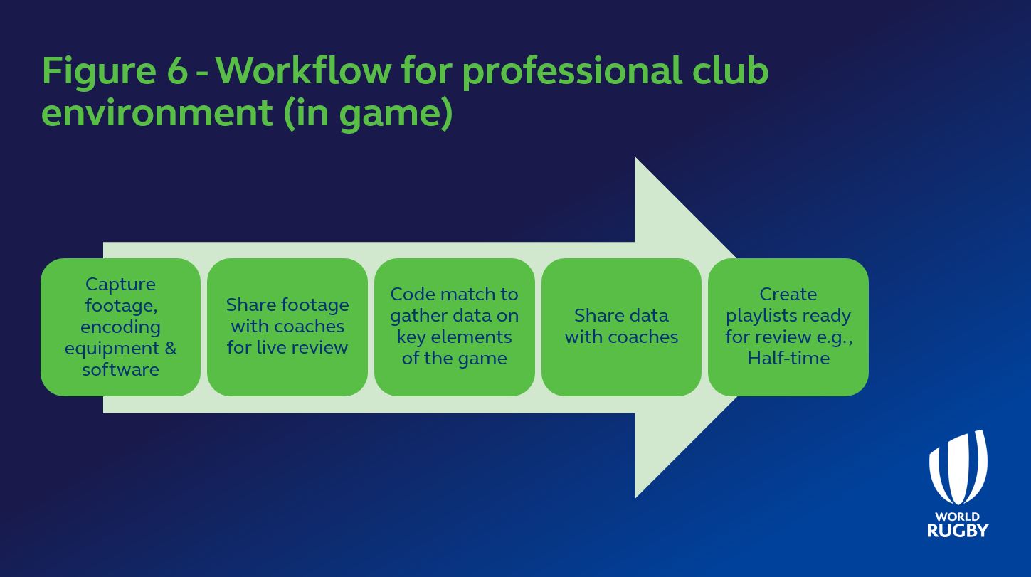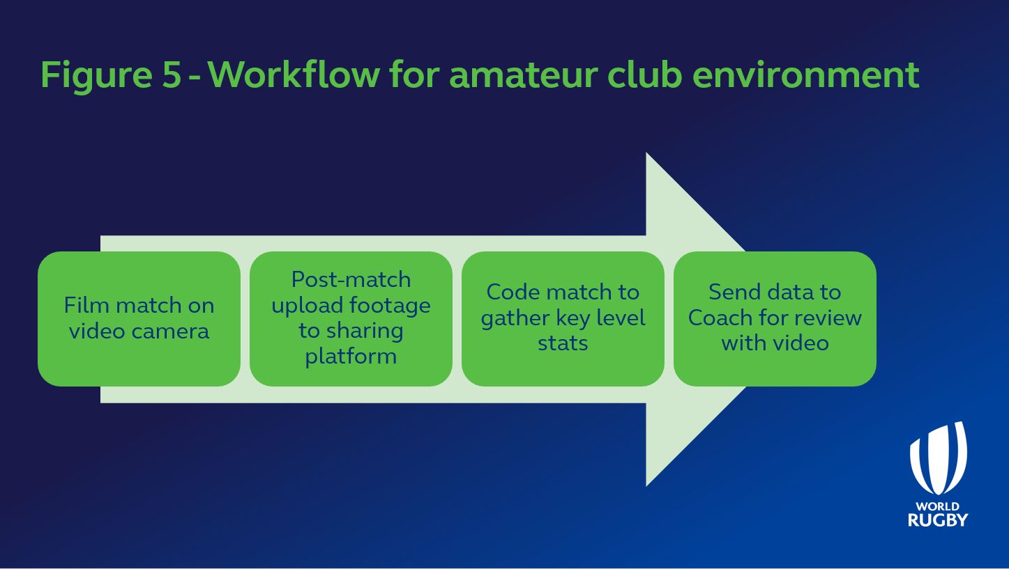 Three types of workflow are presented in the figures below. The first is for a typical single match day analysis within an amateur club, the second and third are workflows within a professional club with greater resources and demand on information.