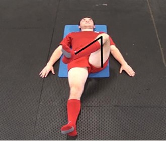 When administering this test, it is important to establish a baseline position, which is parallel to the midline of the body as shown by the black line along the player’s thigh in Figure 1a and 1b. Then, with reference to this, the test administrator can estimate the degrees of rotation or preferably use a goniometer to attain a more accurate measurement. To examine internal range of motion, from the supine position, bring the player’s lower leg and foot outwards and as far away from their body as they comfortably can as shown in Figure 1a. From the supine position to examine external range of motion, bring the players lower leg and foot inwards across the body and other leg as shown in Figure 1b