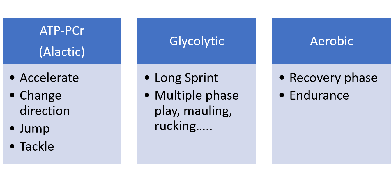 - The Glycolytic energy system. It is relied on for longer, high intensity efforts such as a rolling maul. It is also an anaerobic system and cannot replenish energy stores as quickly as the ATP-PCr system, but it has a greater capacity so it can be relied on for longer.
