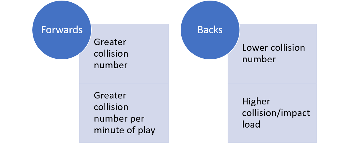 Figure 4. Forwards incur more collisions during play. Backs may experience a greater collision or impact load.
