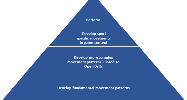 According to Bates and Jeffreys in 2015, open skill drills should follow closed skill drills. Incorporating elements such as a ball, teammates, and opposition into agility training can help players to maximise the transfer between their training and their game performance (Bate & Jeffreys, 2015). Thus, for overall performance, it is important to include both open and closed skill drills in the agility training program. Figure 3. shows how closed chain skills development forms the base for more unpredictable and random open skill development.