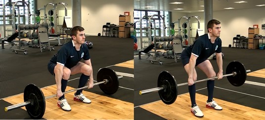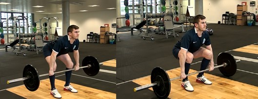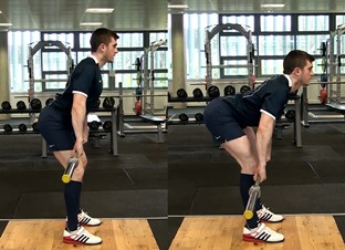 The player stands with the bar at their waist and then straightens their back, bends at the knees, then bends at the hips, moves bar to below knees and holds the position whilst maintaining a strong back.(Figure 8)