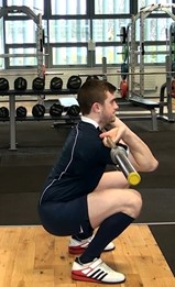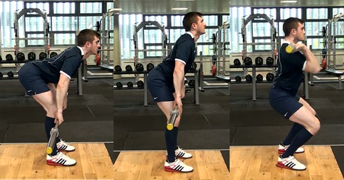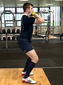 From the slight knee bend position the player "jumps explosively and then catches the bar’’ on their shoulders. The player will land in a quarter Squat position when catching the bar on the shoulders. The cue ‘jump and catch’ will in most instances result in the player landing in a quarter Squat position. The player should remain in this position for a few seconds and then to return the bar to the waist. The player may repeat this sequence for several repetitions. See figure 6.