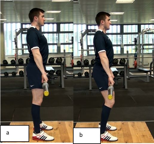 The bar is held at waist level with arms slightly wider than shoulder width. The player then straightens the back (with shoulders back) and then bend knees only to about 10cm (Figure 5.).