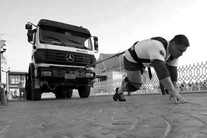 In strongman competitions the Truck Pull is a common event. The athlete wears a harness attached to a vehicle that is to be pulled over a set distance. They assume a 4-point starting position with hands and feet on the ground and use their lower body strength to drive forward pulling the vehicle forwards.