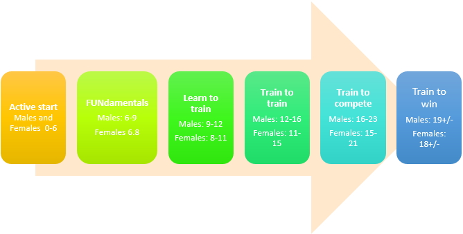 The LTAD model is a multi-stage training, competition and recovery pathway that guides an individual’s experience in sport and physical activity. The stages in the LTAD pathway provide developmentally appropriate programs for all ages with the aim of increasing participation and optimizing performance (Canada Sport Institute, 2014). Rugby would be classified as a late specialisation sport and so the 6 stage LTAD model is often used when looking at long term planning for rugby (Balyi and Hamilton, 2004). Each of these stages will be discussed in detail in the upcoming sections. This model is illustrated in the figure below (Canada Sport Institute, 2014).