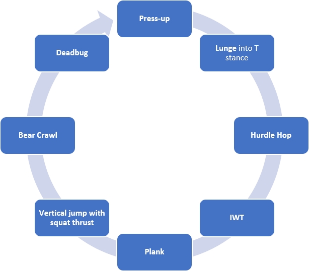 The sample circuit detailed in the diagram below could be used to introduce the players to strength and resistance training as it mainly focuses on body-weight total body exercises. It also utilises exercises that do not need a lot of equipment. This circuit could be integrated into team pitch training and used as a conditioning section. The rest time between the circuits is dictated by the level of fitness of the players. As a starting point, a 2-minute interval can be prescribed before the next circuit. As the players’ strength and fitness levels increase, then more advanced resistance training such as free weights can be used.