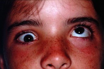 Výron krve do okohybných svalů a jejich okolí brání koordinaci očních pohybů – zřetelnější pří pohledu vzhůru a dolů, přetrvává několik dní po úrazu.