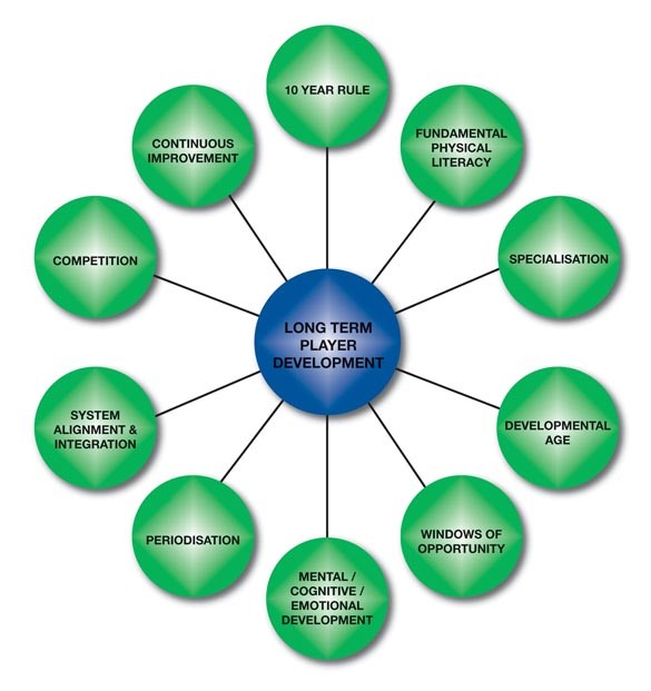 Cesta dlouhodobého rozvoje sportovců byla původně navržena a zavedena nejen do ragby, ale také do jiných sportů, díky práci a vlivu doktora Istvana Balyiho z kanadského National Coaching Institute během 90. let 20. století. Model LTAD navržený Balyim a kolegy se dnes stal jednou z hlavních šablon pro vedení trenérů při rozvíjení technických, taktických a fyzických kompetencí pro lepší přípravu hráčů na hru (Balyi et al, 2005). Šablona není rigidním normativním modelem, ale spíše ji lze považovat za soubor pokynů, které vždy zdůrazňují důležitost přístupu zaměřeného na hráče. Model LTAD je založen na souboru 10 klíčových principů (Balyi et al, 2005). Jsou znázorněny na obrázku níže.