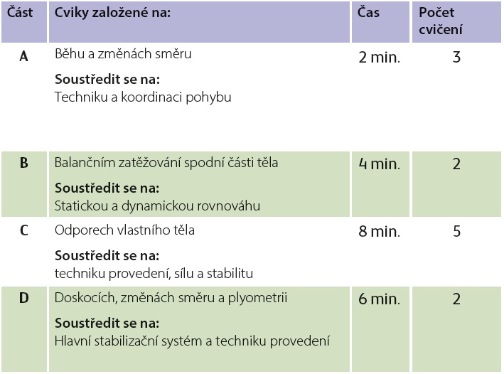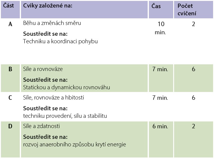 Program začíná zahřátím za běhu, následovaný cvičením na rozvoj balančních schopnosti pro dolní končetiny, síly, pohyblivosti a kontroly pohybu při doskakování a změně směru. Nejvhodnějším místem pro provozování všech cvičení jsou přírodní, travnatá hřiště nebo hřiště s umělým travnatým povrchem a s dostatečným prostorem kolem. Lze však použít i neklouzavý vnitřní povrch (například sportovní hala). Trenéři by měli vždy zkontrolovat dané cvičiště, aby se ujistili, že nehrozí jakékoliv rizika spojené s možnosti se zranit o vnější předmět.