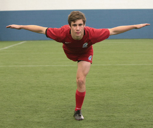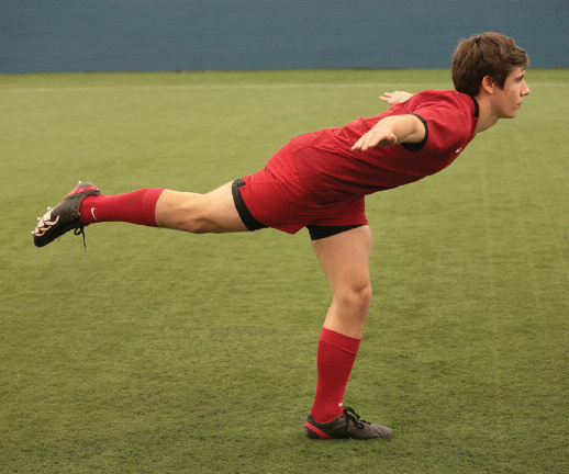 Das Körpergewicht ruht auf einem Bein, das leicht gebeugt ist. Nun nach vorne lehnen, Rücken gerade halten und die Arme seitlich ausstrecken. Das hintere Bein ist gerade nach hinten gerichtet, leicht schräg zum Rücken.
