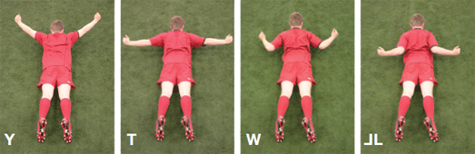 Hierbei handelt es sich um einen Schulterzirkel in Bauchlage zur Kräftigung und Stabilisierung der Muskeln der oberen Rückenpartie und der Schultern. Mit den Buchstaben Y, T, W und L wird die durch die Bauchlage-Positionen jeweils gebildete Form beschrieben.