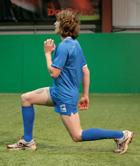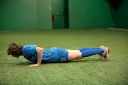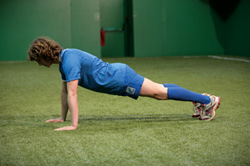 Diese Übung wird am besten mithilfe eines Partners absolviert. Ein Spieler nimmt eine kniende Position ein, während der zweite sich direkt dahinter positioniert. Eine Person kniet sich auf eine weiche Oberfläche, wobei der Partner die Knöchel des Betroffenen sichert und festhält. Dann geht der Spieler langsam, mit einer geraden Haltung hinunter bis zum Boden, wobei die Absenkung mit den offenen Handflächen abgedämpft wird. Die Schulterblätter sollten nach hinten unten gezogen bleiben, während der Rücken flach bleibt. Der Kopf sollte möglichst nicht gesenkt werden, daher das Kinn nicht auf der Brust absetzen. Nun sollte sich der Spieler wieder selbst nach oben drücken, ohne dabei die Mitte der Oberschenkelrückseite einzusetzen.