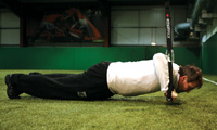 Der Rücken bleibt gerade und flach, wobei während der gesamten Übung eine kontrollierte Absenk-/Aufstemmbewegung beibehalten wird. Schultern und Hüfte bilden eine Linie, um ein Anheben oder Absenken des Pos zu verhindern.