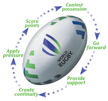 Rugby ist ein Einfall- und Ausweichspiel; Ziel nach Übernahme des Ballbesitzes ist es, den Ball (tragend oder kickend) nach vorne ins gegnerische Feld zu bringen und letztlich Punkte zu erzielen. Wichtig ist, dass alle mit den Grundprinzipien des Spiels vertraut sind und wissen, inwiefern diese mit den für das Spiel erforderlichen Fertigkeiten in Zusammenhang stehen.