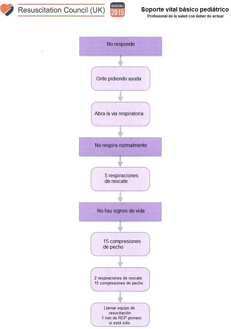 El algoritmo de soporte vital básico pediátrico que se muestra arriba es similar al algoritmo de adultos. Las principales diferencias están en que al identificar que el paciente pediátrico no está respirando se deben realizar 5 respiraciones de rescate/ventilaciones antes de buscar más señales de vida, por ejemplo, el pulso. Si después de efectuar las 5 respiraciones de rescate/ventilaciones no hay señales de vida, entonces se deben realizar 15 compresiones de pecho.