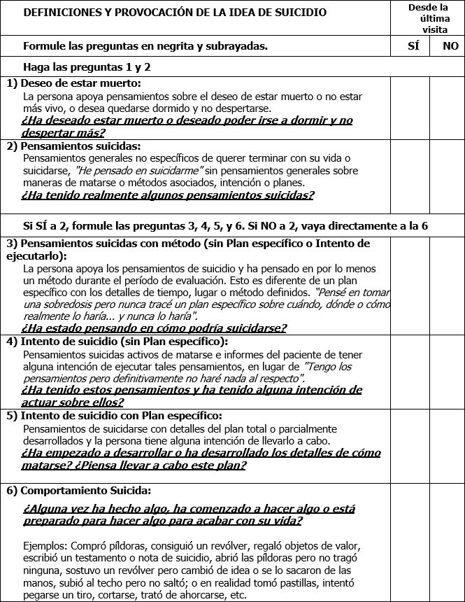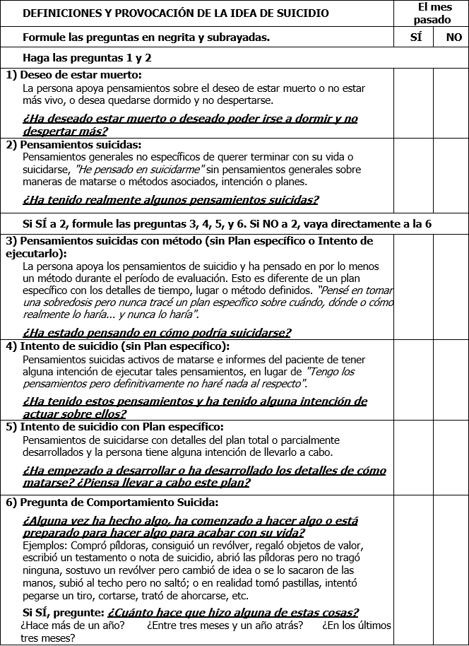 Interpretación: si alguien responde "sí" a las preguntas sobre plan o intento e intento pasado, especialmente durante el año último, se debe considerar de alto riesgo y generalmente requiere una evaluación más exhaustiva.