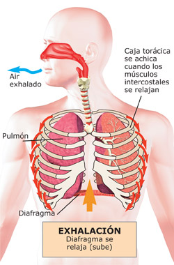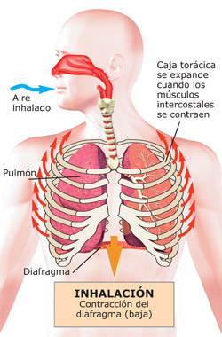 La respiración normal silenciosa involucra al diafragma, una delgada hoja muscular que atraviesa el cuerpo separando el pecho del abdomen. El diafragma sube y baja con la respiración, contribuyendo a llevar el aire a los pulmones. Los músculos entre las costillas (músculos intercostales) también ayudan a hacer que el tórax se amplíe cuando inspiramos o expiramos aire al respirar.