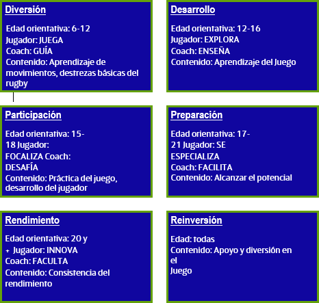 Tenga en cuenta que el ejemplo que sigue usa la edad cronológica para definir las diferentes etapas del modelo LTPD de World Rugby. Las mejores prácticas para las primeras etapas consisten en utilizar la edad biológica, ya que algunos jugadores jóvenes maduran antes que otros y algunos después (Lloyd y Oliver, 2012) (Balyi & Hamilton, 2004). Este recurso pone el foco en la etapa de DIVERSIÓN.