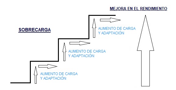 El principio de "sobrecarga" establece que el cuerpo se adapta al estrés o al estímulo del entrenamiento si trabaja con más rigor que lo normal o más tiempo que lo normal. Si la sobrecarga se programa de forma gradual y regular el cuerpo se adapta de modo que el aumento de estrés se pueda tolerar. Las mejoras y las adaptaciones no se pueden producir sin una sobrecarga en el esfuerzo o en la intensidad de las sesiones. Si el esfuerzo o la intensidad del entrenamiento es bajo podría ocurrir un desentrenamiento (Izquierdo y otros, 2007). El diagrama a continuación muestra que si se aplica la sobrecarga y se permite la suficiente recuperación entre sesiones de entrenamiento, se logra la adaptación y la mejora. Sin embargo, si se aplica una sobrecarga y no se proporciona una recuperación adecuada, se produce fatiga (Bompa 2000, 2005). Es importante que cualquier sobrecarga se aplique de manera gradual y progresiva y que el tiempo de recuperación se planifique adecuadamente. Los principios FITT discutidos antes se pueden usar para manejar la sobrecarga colocada en el jugador.