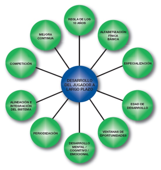 El programa de Desarrollo del Deportista a Largo Plazo fue originalmente propuesto e incorporado no solo al rugby sino también a otros deportes a través del trabajo y la influencia del Dr. Istvan Balyi del Instituto Nacional de Coaching de Canadá durante los noventa. Hoy, el modelo LTAD propuesto por Balyi y sus colegas se ha convertido en uno de los principales modelos para guiar a los entrenadores y dirigentes en el desarrollo de las competencias técnicas, tácticas y físicas para preparar mejor a los jugadores para el rugby (Balyi y otros, 2005). El modelo no es una guía prescriptiva rígida sino que se puede ver como un conjunto de lineamientos que enfatizan en todo momento la importancia de un enfoque centrado en el jugador. El modelo LTAD se basa en un conjunto de 10 principios clave (Balyi y otros, 2005). Se ilustran en la figura que sigue.