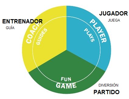 Como estamos considerando el rugby, específicamente, las habilidades fundamentales del movimiento deben integrarse de un modo tal que introduzca las destrezas técnicas y tácticas del rugby. El diagrama que sigue es una representación simple de los roles durante el entrenamiento de rugby en esta etapa (IRFU, 2006).