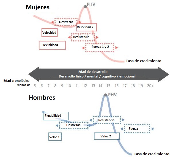 El modelo LTAD también incluye ventanas de oportunidades para entrenar ciertas capacidades físicas. Estas ventanas de oportunidades y las edades con las que están asociadas se muestran en el diagrama que sigue (Canada Sport Institute, 2014).