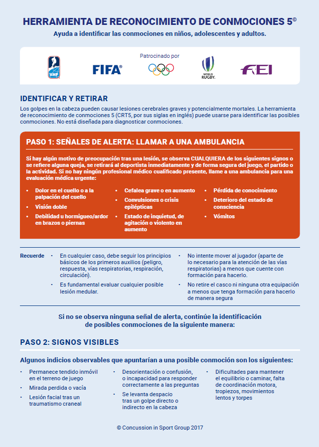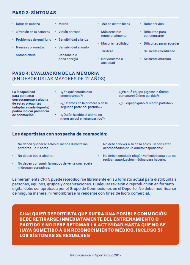Los síntomas más comunes incluyen baja concentración, pérdida de memoria y dificultades de equilibrio. La Herramienta de Bolsillo de Reconocimiento de la Conmoción cerebral (Pocket Concussion Recognition Tool que se muestra abajo) puede ayudar a identificar una conmoción cerebral.