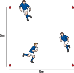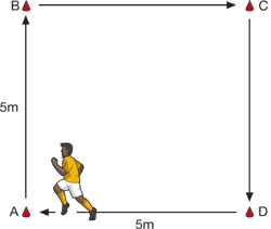 Hay dos versiones de este ejercicio. En el ejercicio 1 los jugadores corren hasta el primer cono donde deben hacer un pase, continuar hasta el próximo y hacer un pase de vuelta. Cuando llegan hasta el último cono corren a máxima velocidad hasta el principio. En este ejercicio se toma el tiempo y se alienta a los jugadores a que se concentren en hacer un buen pase. La distancia entre los conos es de 10m.