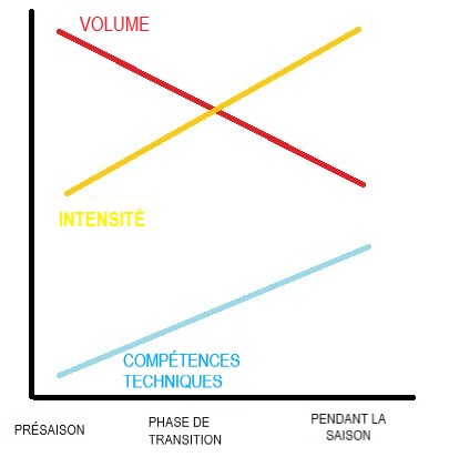 La phase préparatoire spécifique est la phase qui réalise la transition de l'exercice ou entraînement général vers l'exercice ou l'entraînement spécifique au sport. Dans cette phase, l’objectif est de continuer à développer la capacité d'effort des joueurs mais en se concentrant sur des activités plus spécifiques au sport (Bompa et Haff, 2009). Par exemple, dans la phase préparatoire générale, la course peut être de faible intensité sur une longue distance pour développer le « moteur » du joueur ; par contre, pendant la phase préparatoire spécifique, l’entraînement par intervalles de haute intensité relié au jeu et présenté dans le module précédent pourrait être appliqué. Dans cette phase, le volume commence à diminuer tandis que l'intensité augmente progressivement. L'entraîneur veut que ses joueurs soient capables de gérer les intensités d'un match de compétition. L'intensité de l'entraînement doit donc augmenter afin de préparer les joueurs à l'approche de la saison compétitive. Le diagramme ci-dessous (Turner, 2011) illustre bien la relation entre le volume et l'intensité au cours de la saison. Cela indique également que l'accent mis sur la technique et les compétences s'accroit à mesure que la période de compétition se rapproche.