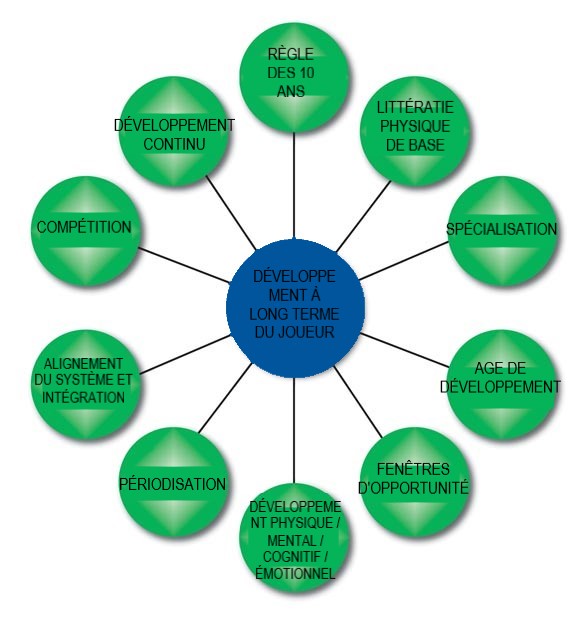 À l'origine, le programme de Développement du joueur à long terme a été proposé et introduit non seulement pour le rugby mais aussi pour d’autres sports, à travers le travail et l’influence du Dr. Istvan Balyi de l'Institut national d'entraînement du Canada, dans les années 90. Aujourd’hui, le modèle DJLT proposé par Balyi et ses collègues est devenu l'un des principaux modèles pour guider les entraîneurs et administrateurs dans le développement des compétences techniques, tactiques et physiques pour mieux préparer les joueurs à l’activité (Balyi et al, 2005). Ce n’est pas un modèle rigide et prescriptif, mais il peut être envisagé plutôt comme une série de lignes directrices mettant l’accent sur l’importance d’une approche centrée sur le joueur de façon permanente. Le modèle est basé sur 10 principes clés (Balyi et al, 2005), illustrés dans l’image ci-dessous.