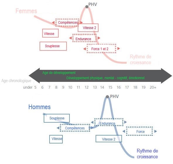 L'objectif principal de cette étape est d'apprendre les habiletés motrices fondamentales et de développer les habiletés motrices globales (Institut du sport du Canada, 2014). La tranche d'âge chronologique pour cette étape est de 6 à 9 ans pour les garçons et de 6 à 8 ans pour les filles. Selon Balyi et Hamilton (2004), les habiletés motrices fondamentales devraient être pratiquées et maîtrisées avant que des compétences spécifiques au sport ne soient introduites. Le développement de ces compétences par le biais d'une approche positive et ludique, devrait contribuer de manière significative aux capacités sportives futures. La participation à un large éventail de sports est également encouragée. C'est là une opportunité de développer un large éventail de compétences motrices plutôt que juste des compétences motrices spécifiques à un sport ou à une position donnés. Cela devrait produire des joueurs équilibrés qui ont une meilleure capacité d'entraînement pour un développement à long terme spécifique à un sport (Balyi et Hamilton, 2004). Les habiletés motrices fondamentales comprennent les habiletés de locomotion (marche, course, saut, etc.), de stabilisation (atterrissage, rotation, équilibre, etc.) et de manipulation (lancer, frapper, etc.) (Balyi et Hamilton, 2004). Le modèle DJLT a également noté des fenêtres d'opportunité d’entraînement de certaines capacités physiques. Le diagramme ci-dessous illustre ces fenêtres d'opportunité et les âges auxquels elles sont associées (Institut canadien du sport, 2014).