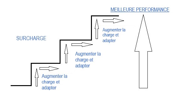 Le principe de « surcharge » spécifie que le corps s'adapte au stress ou au stimulus de l'entraînement s'il est plus fort ou plus long que d'ordinaire. Si la surcharge est graduelle et régulière, le corps s'adapte de sorte que le stress accru puisse être toléré. Les améliorations et les adaptations ne peuvent se produire sans une surcharge de l'effort ou de l'intensité lors des séances. Si l'effort ou l'intensité de l'entraînement est faible, un désentraînement pourrait alors se produire (Izquierdo et al, 2007). Le diagramme ci-dessous montre que si la surcharge est appliquée et que la récupération entre les séances d’entraînement est suffisante, alors l’adaptation et l’amélioration sont obtenues. Toutefois, si la surcharge est appliquée mais que la récupération n'est pas suffisante, la fatigue survient (Bompa 2000, 2005). Il est important que toute surcharge soit appliquée de manière graduelle et progressive et que le temps de récupération soit planifié de manière adéquate. Les principes FITT présentés auparavant peuvent être utilisés pour manipuler la surcharge placée sur le joueur.