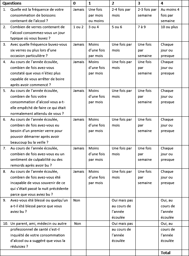La présence éventuelle d'un trouble lié à l'abus d'alcool peut être évaluée avec l'aide d'AUDIT.