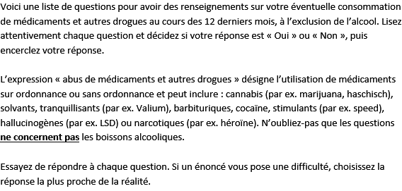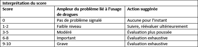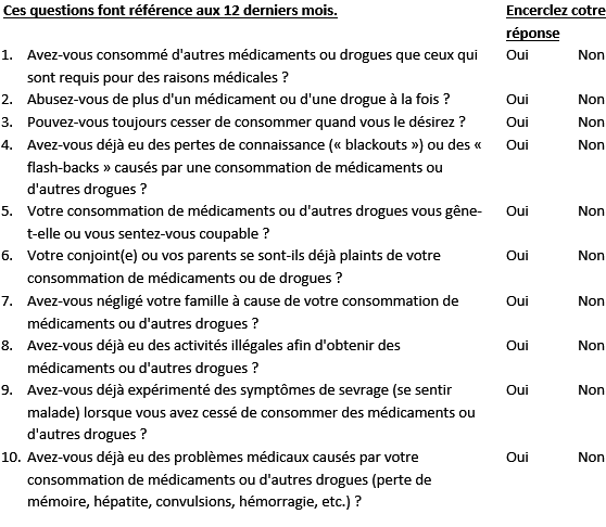 Les troubles liés à l'utilisation de substances peuvent être évalués avec l'aide du DAST-10.