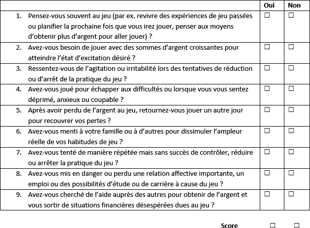 La présence d'un trouble de jeu pathologique peut être évaluée avec l'aide du Formulaire de diagnostic du jeu pathologique DSM-V.