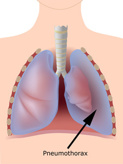 Les victimes atteintes d'un collapsus peuvent se plaindre d'une douleur vive à la poitrine qui s'empire au moment de l'inspiration. La plupart des jeunes adultes en bonne santé arrivent à gérer correctement le collapsus d'un poumon, mais ils peuvent bleuir en cas de cyanose si la quantité d'oxygène arrivant dans le sang est insuffisante avec un seul poumon. Les victimes peuvent montrer des signes de blessure de la paroi thoracique, telle qu'une douleur et une sensibilité au niveau d'une côte fracturée qui aurait percé le poumon, ou l'examen de la paroi thoracique peut être normal si le pneumothorax est « spontané ».