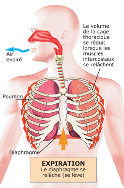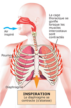 Une respiration calme et normale sollicite le diaphragme, une fine feuille musculaire qui traverse le corps et sépare le thorax de l'abdomen. Le diaphragme monte et descend lors de la respiration, et aide ainsi à faire entrer l'air dans les poumons. Les muscles entre les côtes (muscles intercostaux) aident également à gonfler le thorax pour que l'air entre et sorte pendant la respiration.