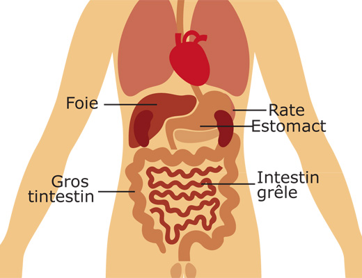 Plusieurs organes du corps peuvent être blessés et saigner. Les organes habituels se trouvent dans la partie supérieure de l'abdomen et sont principalement protégés par les côtes inférieures. Il s'agit du foie sur la droite et de la rate sur la gauche.