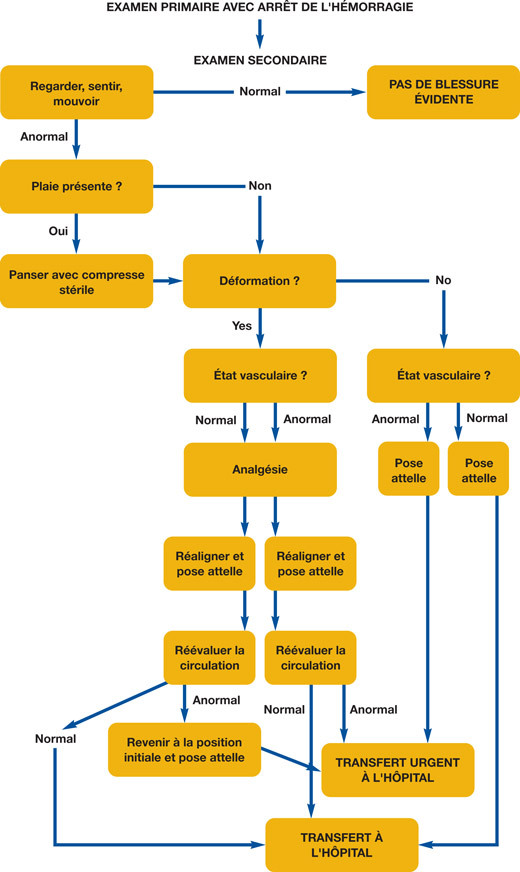 La gestion des blessures présentant potentiellement un risque vital et impliquant les voies aériennes ou la fonction respiratoire doit toujours avoir priorité sur les fractures des extrémités. La seule exception à cette règle est la présence d'une hémorragie externe massive. La reconnaissance et la gestion de la plupart des hémorragies externes ne présentant pas de danger vital font partie de l'évaluation de la fonction circulatoire. Les hémorragies moins évidentes et/ou les déformations des membres sont généralement identifiées au cours de l'exposition de l'examen primaire ou au cours de l'examen secondaire.