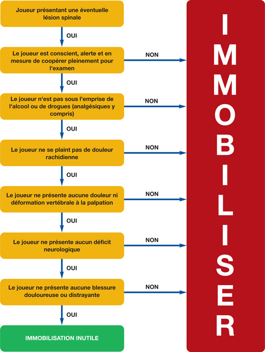 L'immobilisation spinale doit être envisagée dès lors que les circonstances de la blessure ainsi que les signes et symptômes que présente le joueur semblent désigner une lésion médullaire. Un organigramme illustrant les directives du Comité de liaison JRCALC (Joint Royal Colleges Ambulance Liaison Committee, 2006) permettant de prendre une décision en matière d'immobilisation spinale vous est proposé ci-dessous.