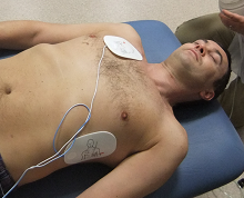 Una volta che il DAE è posizionato accanto al paziente, deve essere acceso. Il DAE chiederà ai soccorritori di attaccare le piastre al petto nudo del paziente e di collegare il connettore al DAE. Una piastra deve essere posizionata a destra dello sterno superiore appena sotto la clavicola e l'altra nella linea ascellare media, lateralmente e inferiormente al tessuto pettorale. Per facilitare l'operazione, la maggior parte delle piastre ha un'immagine sul retro che funge da guida al corretto posizionamento. La RCP non deve essere interrotta mentre le piastre vengono posizionate sul petto del paziente.