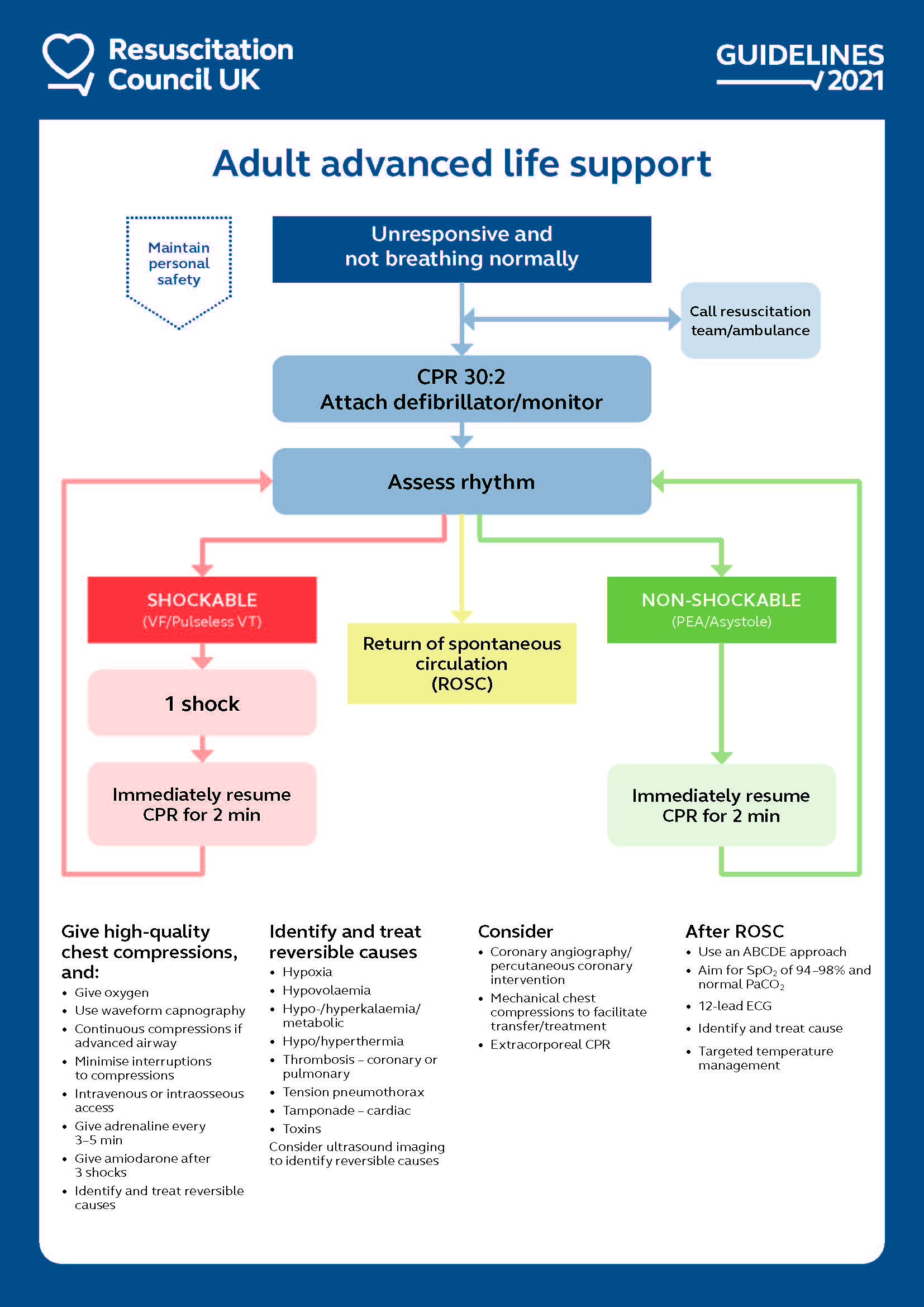 È importante che siano effettuate compressioni toraciche di buona qualità (profondità di 5-6 cm, frequenza di 100-120 per minuto) e ventilazioni efficaci in un rapporto di 30:2 con interruzioni minime. Senza tale operazione, è estremamente improbabile che si ottenga un ripristino della circolazione spontanea.