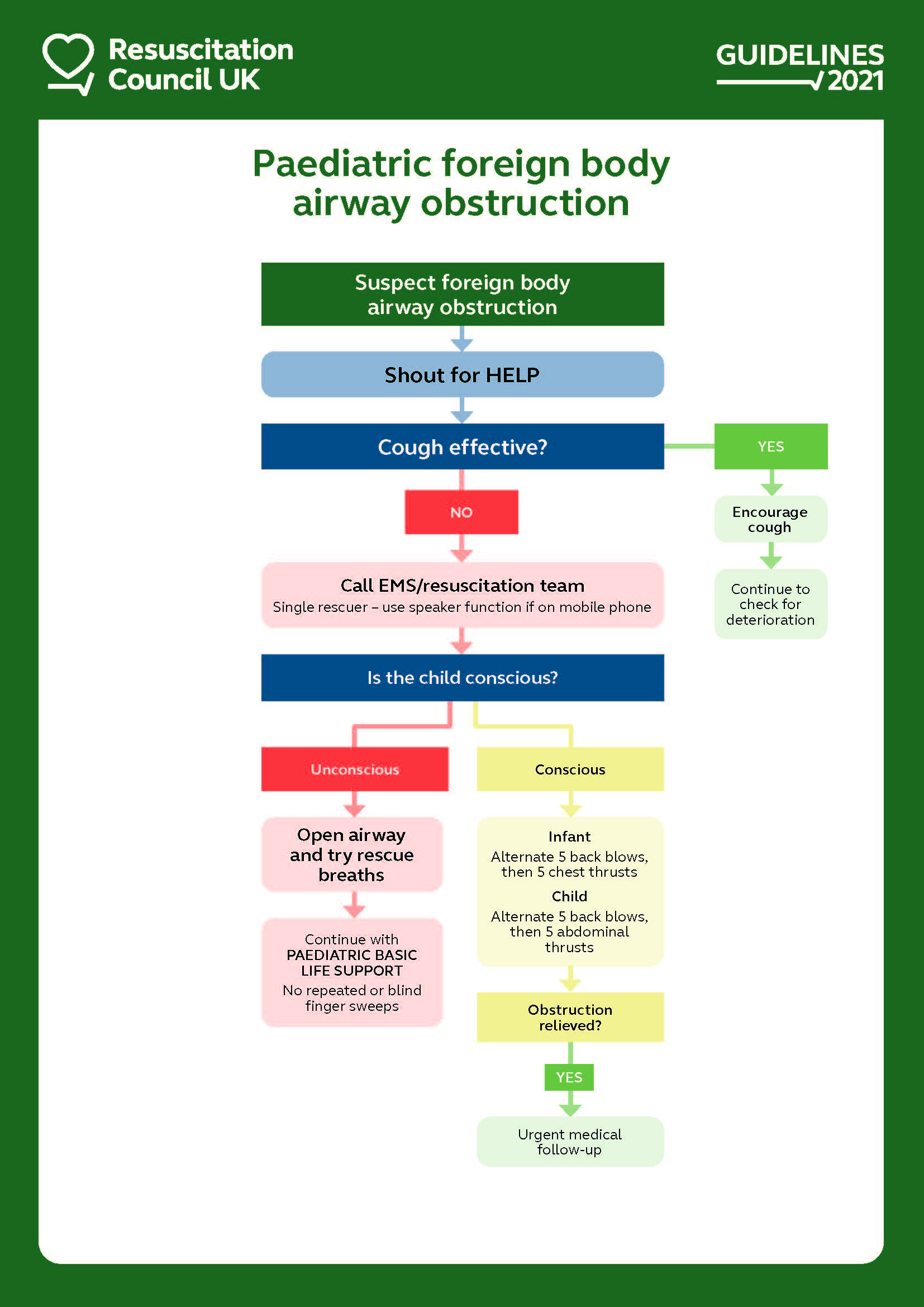 L'algoritmo di soffocamento pediatrico è simile a quello per gli adulti. Le differenze principali consistono nel fatto che se un paziente pediatrico diventa incosciente, devono essere effettuati 5 respiri/ventilazioni di emergenza prima di iniziare la RCP con un rapporto di 15 compressioni a 2 respiri. Se il paziente pediatrico ha meno di un anno di età, le spinte addominali non devono essere effettuate e sono sostituite da spinte sul torace.