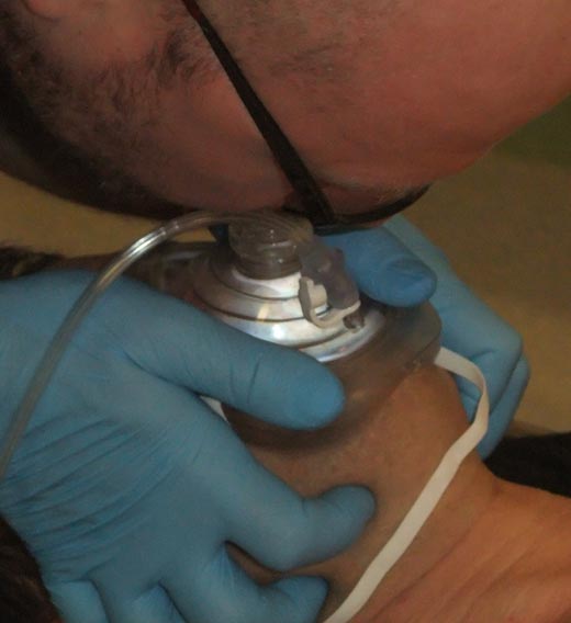 Ventilazione dell'aria espirata usando una maschera tascabile con ossigeno attaccato.