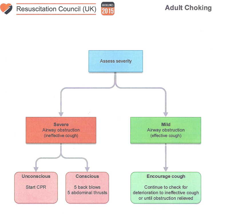 L'algoritmo di trattamento del soffocamento negli adulti mostra chiaramente che se un giocatore sta soffocando con una tosse efficace deve essere incoraggiato a continuare a tossire nella speranza che sia in grado di rimuovere il corpo estraneo da solo.