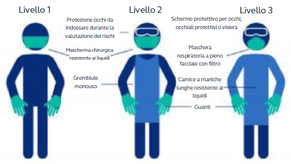 Per i Paesi con una prevalenza della malattia più bassa, i DPI di livello 1 possono essere sufficienti per medici e fisioterapisti a bordo campo e sul campo; un aumento della probabilità indica l’uso di DPI di un livello più rigido.