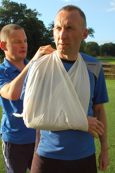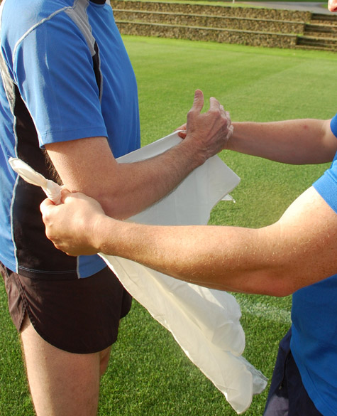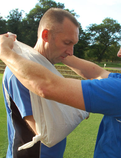 Si tratta di una semplice imbracatura per sostenere l'arto superiore utilizzando una fascia triangolare.
