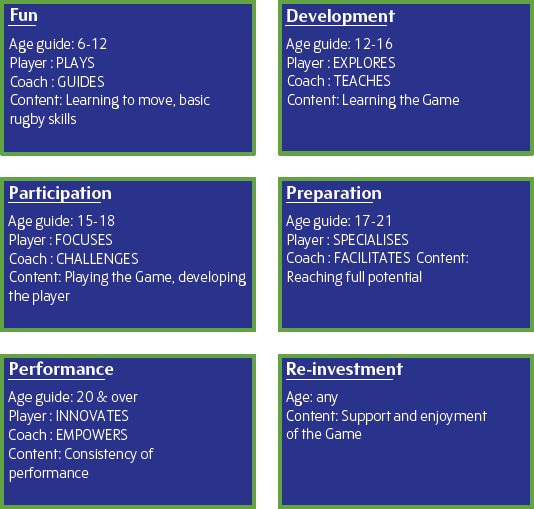 以下の例は、ワールドラグビーのLTPDの各段階を定義するために暦年齢を用いています。若年層のプレーヤーには、他のプレーヤーよりも早く成熟する子どもと遅く成熟する子どもがいるため(Lloyd & Oliver, 2012)(Balyi & Hamilton, 2004)、初期の段階において一番良い方法は、生物学的年齢を使用することです。この資料は、FUNステージに焦点を置いています。
