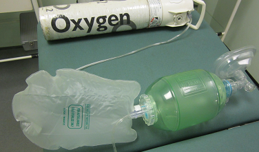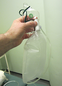 救急事態によっては、換気補助が必要となり、補助酸素を取り付けたバッグ・バルブ・マスクを使用します。
